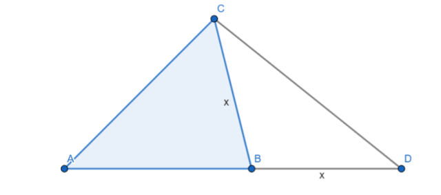 W trójkącie ABC przedłużono bok AB poza wierzchołek B i odłożono odcinek BD, który ma taką samą długość jak odcinek BC. Następnie połączono punkty C i D. Wykaż, że miara kąta CDA jest równa połowie miary kąta CBA.