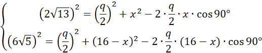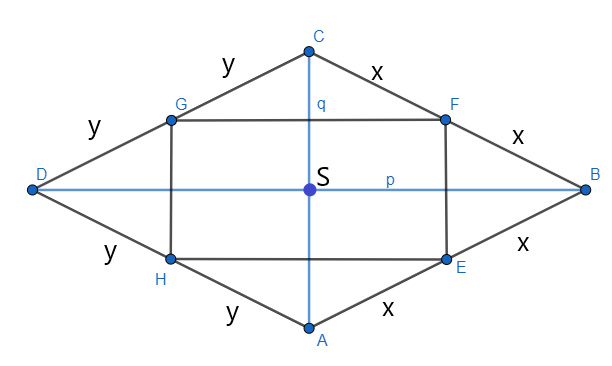 Przyjmij oznaczenia jak na rysunku powyżej. Skorzystaj z twierdzenia odwrotnego do twierdzenia Talesa, aby pokazać, że proste EF i AC, HG i AC, EF i HG, EH i FG, FG i BD, EH i BD, EH i FG są parami równoległymi. Czworokąt EFGH jest prostokątem, ponieważ w deltoidzie przekątne przecinają się pod kątem prostym. Wykorzystaj fakt, że odcinek łączący środki ramion trapezu jest równy średniej arytmetycznej długości podstaw. Przyjmij oznaczenia jak powyżej i skorzystaj z twierdzenia cosinusów i oblicz q i x. Wyznacz długość drugiego boku prostokąta EFGH i na koniec obwód prostokąta EFGH.
