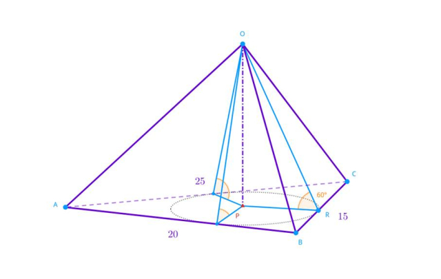 Na trójkącie o bokach długości: 15 cm, 20 cm, 25 cm zbudowano ostrosłup w taki sposób, że każda ze ścian bocznych tej bryły jest nachylona pod kątem 60° do płaszczyzny podstawy ostrosłupa. Oblicz objętość oraz pole powierzchni tak powstałej bryły.