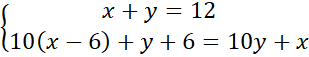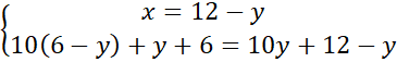 Cyfra dziesiątek pomniejszona o 6 (10(x-6)) dodać cyfra jedności powiększona o 6 (y+6) jest równe (ustawionej w odwrotnej kolejności) liczbie dziesiątek (10y) dodać liczbę jedności (x). Całość ma postać: