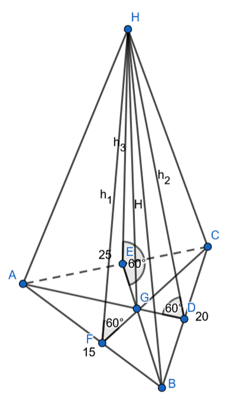 Wyznacz objętość i pole powierzchni całkowitej ostrosłupa, którego podstawą jest trójkąt, którego boki mają długość: 15 cm, 20 cm, 25 cm, a wszystkie ściany boczne ostrosłupa są nachylone do płaszczyzny podstawy pod kątem 60°.