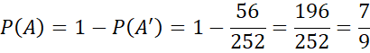 Oblicz ilość wszystkich sprzyjających zdarzeń przeciwnemu i wszystkich zdarzeń elementarnych. Następnie skorzystaj z twierdzenia na prawdopodobieństwo zdarzenia przeciwnego: