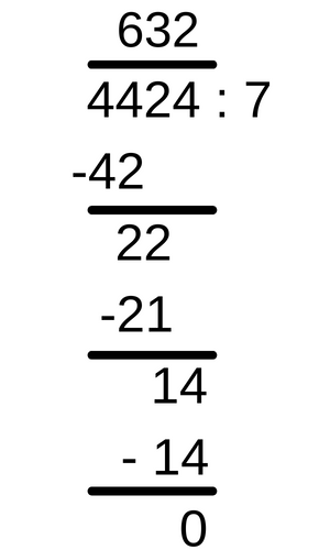 Na początku należy zauważyć, że cyfra dziesiątek dzielnej przejdzie o jedno miejsce w dół przy dzieleniu i bezpośrednio pod nią też będzie 2. Potem należy zauważyć, że skoro wynikiem z dzielenia pewnej liczby przez 7 jest 6, to liczbą, jaką należy odjąć od liczby utworzonej z cyfr tysięcy i setek dzielnej jest 6 · 7 = 42. Cyfrą dziesiątek wyniku jest cyfra 3, więc od liczby w czwartej linijce od góry należy odjąć 3 · 7 = 21, będzie to liczba w piątej linijce, licząc od góry. Następnie po odjęciu 21 od 22 w szóstej linijce od góry będzie 1 jako liczba dziesiątek. Wiadomo, że po podzieleniu jej przez 7 nie będzie reszty z dzielenia, a jedyną liczbą dwucyfrową z cyfrą dziesiątek 1, która dzieli się bez reszty przez 7, jest 14, więc w szóstej i siódmej linijce od góry będzie 14.
