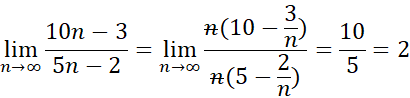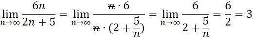 Jeśli spotkamy się z ułamkiem tak, jak w tym przypadku, to należy wyłączyć z licznika i mianownika najwyższe potęgi liczby n. Następnie musisz skrócić wyłączone n. Dalej trzeba sprawdzić, ile wynosi granica z każdego składnika w liczniku i mianowniku.