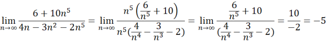 Jeśli spotkamy się z ułamkiem tak, jak w tym przypadku, to należy wyłączyć z licznika i mianownika najwyższe potęgi liczby n. Następnie musisz skrócić wyłączone n. Dalej trzeba sprawdzić, ile wynosi granica z każdego składnika w liczniku i mianowniku.