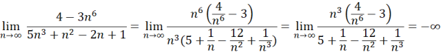 Jeśli spotkamy się z ułamkiem tak, jak w tym przypadku, to należy wyłączyć z licznika i mianownika najwyższe potęgi liczby n. Następnie musisz skrócić wyłączone n. Dalej trzeba sprawdzić, ile wynosi granica z każdego składnika w liczniku i mianowniku.