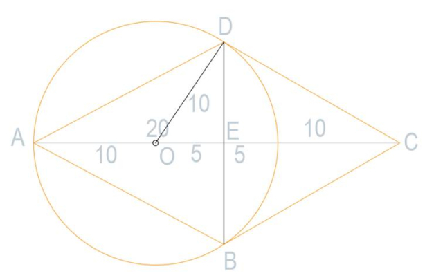 Dany jest okrąg i romb. Okrąg przechodzi przez 3 wierzchołki rombu, dzieląc jego dłuższą przekątną na długości 20 i 10. Jakie pole tego rombu?