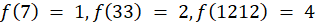 W tym zadaniu musisz podać wartość funkcji dla 7, 33 i 1212, jeżeli funkcja f każdej liczbie naturalnej przyporządkowuje liczbę jej cyfr.