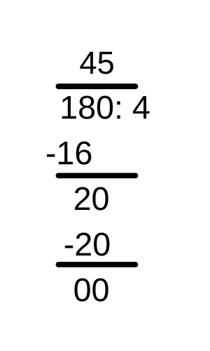 Żeby znaleźć liczbę ukrytą pod x, należy 180 podzielić przez 4. Wykonując dzielenie pisemne, należy najpierw podzielić pierwszą cyfrę od lewej dzielnej przez dzielnik. Jeśli jednak dzielnik nie zmieściłby się w pierwszej cyfrze dzielnej od lewej, to należy wziąć pierwsze dwie cyfry dzielnej i wtedy podzielić je przez zielnik. Wynik z takiego dzielenia należy zapisać nad ostatnią cyfrą dzielnej, która była brana pod uwagę przy obliczeniach. Następnie zapisaną na górze w wyniku cyfrę należy pomnożyć przez dzielnik i zapisać pod liczbami, które dzielono wcześniej i wykonać odejmowanie. Wynik z odejmowania należy zapisać pod tymi liczbami i dopisać do niego kolejną cyfrę z dzielnej, jaka jest w kolejności i powtórzyć te same kroki co wcześniej podczas dzielenia. Dzielenie wykonuje się tak długo, aż nad cyfrą jedności dzielnej będzie w wyniku jakaś cyfra.