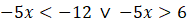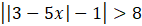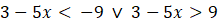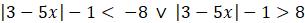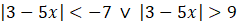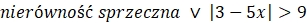 Rozwiąż drugą nierówność, ponownie dzieląc ją na alternatywę dwóch nierówności.Od obu nierówności odejmij obustronnie 3, a następnie podziel je przez -5 (pamiętając o zmianie znaku nierówności).