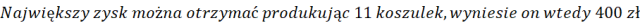 W tym zadaniu musisz wyznaczyć, ile koszulek dziennie powinien szyć zakład, aby jego dzienny zysk był największy i jaka jest wartość największego zysku. Zakład może uszyć dziennie co najwyżej 18 koszulek cena jednej wynosi 86 zł. Związek między kosztem produkcji