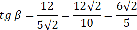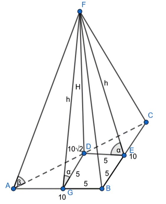 Wyznacz tangens kąta nachylenia krawędzi bocznej do płaszczyzny podstawy, którego podstawą jest trójkąt prostokątny równoramienny, którego dwa boki mają długość 10, a cosinus kąta nachylenia dwóch ścian bocznych tego ostrosłupa do płaszczyzny podstawy jest równy