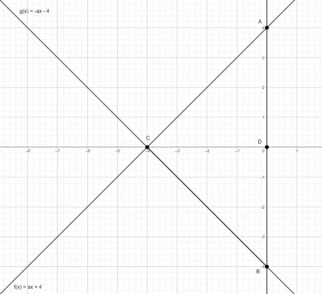 Stwórz rysunek pomocniczy uwzględniając fakt, że jest funkcją rosnącą jest malejąca. Wyznacz długość odcinka |AB| oraz |CD|, gdzie D to początek układu współrzędnych. Oblicz pole trójkąta korzystając ze wzoru i z powstałego w ten sposób równania z wyznacz jego wartość.