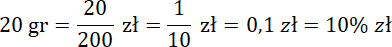 Pamiętaj, 2 złote to 200 groszy, czyli 20 groszy to dwadzieścia dwusetnych złotówki. Wynik podaj jako ułamek zwykły: w liczniku wpisz liczbę groszy z zadania, a w mianowniku – liczbę groszy w złotówce, skróć go; ułamek dziesiętny: zamień ułamek zwykły o mianowniku 100 na postać dziesiętną; procenty: przepisz liczbę z licznika ułamka zwykłego o mianowniku 100 i postaw znak %.