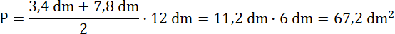 Pamiętaj, pole trapezu to połowa iloczynu jego wysokości i sumy długości jego podstaw. Zapisz w miejscu liter a oraz b wymiary podstaw, a w miejsce litery h – podaną wysokość. Najpierw wykonaj dodawanie w liczniku, a następnie mnożenie. Skróć czynnik z mianownikiem ułamka. Nie zapomnij o właściwej jednostce powierzchni.
