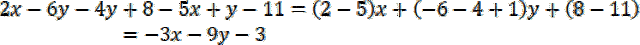 Przekształć dodawanie i odejmowanie wyrażeń zawierających tę samą literę na jedno wyrażenie, którego współczynnik jest sumą współczynników tych wyrażeń. Jeżeli przy literze nie ma współczynnika oznacza to, że jest przy niej współczynnik równy 1. Następnie podstaw wartości x i y do równania.
