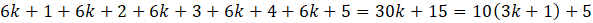 Oblicz resztę z dzielenia sumy pięciu kolejnych liczb całkowitych niepodzielnych przez 6 przy dzieleniu jej przez: 10.