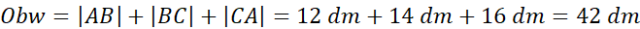 Wyznacz obwód trójką ABC o bokach długości |AB| = 4,3 cm, |BC| = 78 mm, |CA| = 0,64 dm i wyraź go decymetrach oraz określ, który z kątów wewnętrznych ma największą miarę.