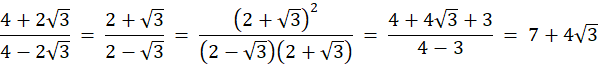 Skróć ułamek przez 2. Przemnóż górę i dół ułamka przez sprzężenie jego mianownika. Sprzężeniem liczby niewymiernej postaci