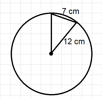 Cięciwa to odcinek łączący 2 punkty na okręgu. Zauważ, że trzeci z boków trójkąta również jest promieniem, ponieważ musi łączyć środek okręgu z jednym z końców cięciwy, a więc ma długość 12 cm. Oblicz obwód dodając do siebie długości wszystkich boków.