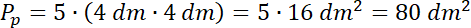 Zauważ, że podstawa składa się z pięciu kwadratów o takich samych wymiarach. Policz pole jednego kwadratu i pomnóż razy pięć, aby uzyskać pole podstawy. Wszystkie ściany boczne mają takie same wymiary, a jest ich tyle, co boków podstawy – 12.
