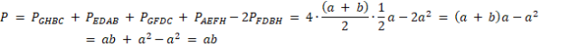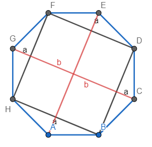 Dłuższa przekątna ośmiokąta jest oznaczona literą b, a krótsza literą a. Pola ośmiokąta można obliczyć jako pole czterech trapezów GHBC, EDAB, GFDC i AEFH, od którego podwójnie odejmie się pole kwadratu FDBH.