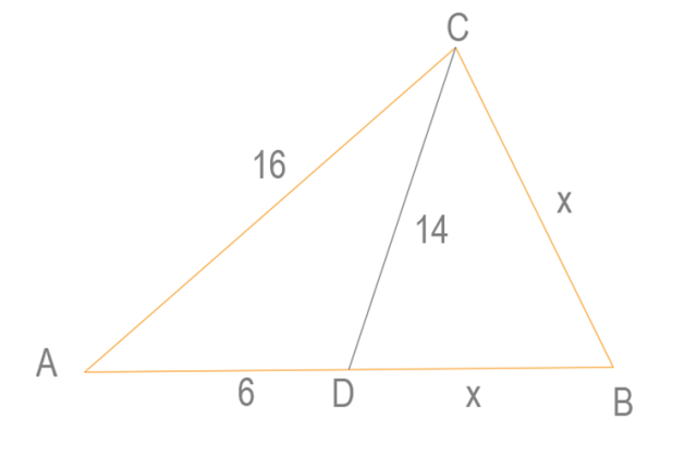 Dany jest trójkąt ABC, w którym D należy do boku AB i |AC| = 16 |AD| = 6 |CD| = 14 i |BC| = |BD|. Znajdź jego obwód.