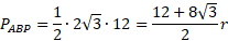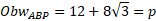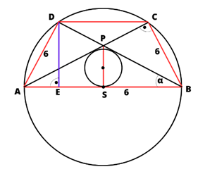 Zauważ, że trójkąt ABC jest prostokątny – jego przeciwprostokątna jest średnicą dużego okręgu. Oblicz kąt nachylenia przekątnych do dłuższej podstawy. Oblicz wysokość trapezu i obwód trójkąta ABP. Wyznacz pole trójkąta ABP ze wzoru