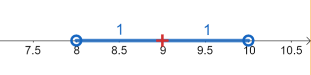 Przedział K jest zbiorem liczb, których odległość od 7 na osi liczbowej jest nie większa niż 3, a przedział M jest zbiorem liczb, których odległość na osi liczbowej od 9 jest mniejsza niż 1. Podaj zbiory: .