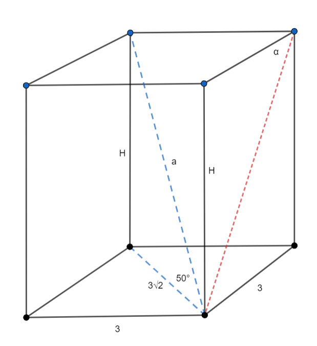 Wyznacz wysokość graniastosłupa H. Skorzystaj z twierdzenia Pitagorasa a2 + b2 = c2, gdzie a i b to długości przyprostokątnych, a c to przeciwprostokątna trójkąta prostokątnego.