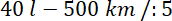 Skoro na 500 km samochód spala 40 l benzyny to na 100 km spali 8 l benzyny.