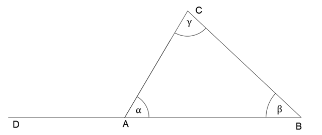 Wykaż, jeśli kąt jest przyległy do dowolnego kąta w trójkącie, to jego miara wynosi tyle, co suma miar pozostałych dwóch trójkątów.