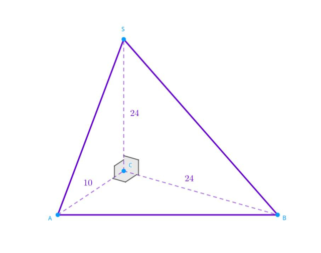 Na trójkącie prostokątnym ABC (o przyprostokątnych: |AC| = 10 cm, |BC| = 24 cm) zbudowano ostrosłup ABCS w taki sposób, że jego spodkiem wysokości jest wierzchołek C. Powstała krawędź CS ma długość 24 cm. Oblicz długości boków trójkąta ABS.