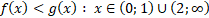 Naszkicuj oba wykresy funkcji i sprawdź, dla jakich argumentów mają ona punkty wspólne. Następnie określ przedziały, w których funkcja g znajduje się nad funkcją f.