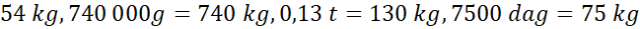 54 kg, 7500 dag, 0,13 t, 740 000 g