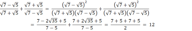 Usuń niewymierności z mianowników obydwu ułamków. Następnie skorzystaj ze wzorów skróconego mnożenia i rozwiń wyrażenia w licznikach. Dodaj do siebie ułamki i uprość wyrażenie.