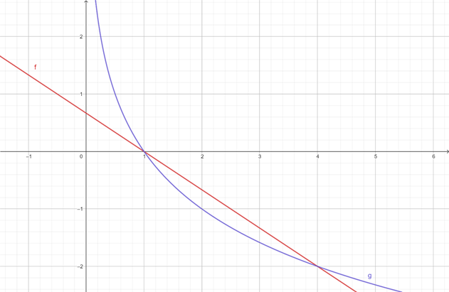 W tym zadaniu należy rozwiązać graficznie równanie, kiedy funkcje f i g są sobie równe oraz określić, kiedy wykres funkcji g znajduje się nad wykresem funkcji f.
