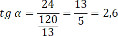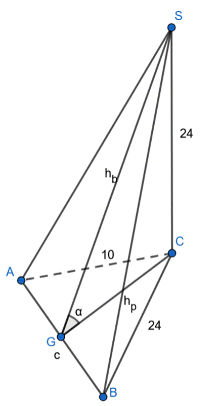 Wyznacz tangens kąta dwuściennego między płaszczyzną (ABS) i płaszczyzną podstawy, jeśli podstawą ostrosłupa ABCS jest trójkąt prostokątny ABC, w którym przyprostokątne mają długość: |AC| = 10 cm, |BC| = 24 cm, spodkiem wysokości ostrosłupa jest wierzchołek C, a wysokość tego ostrosłupa jest równa 24 cm.