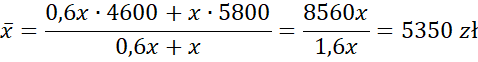 Wyznacz średnie miesięczne wynagrodzenie w obu oddziałach razem, jeżeli wiadomo, że I oddział zatrudnia o 40% pracowników mniej niż II oddział oraz pewna firma ma dwa oddziały, zaś średnie miesięczne wynagrodzenie w I oddziale wynosi 4600 zł, a w II - 5800 zł.
