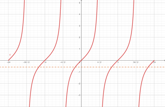 . Odczytaj z wykresu przedziały, kiedy wykres tangensa ma punkt wspólny z prostą y lub znajduje się pod nią.