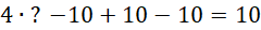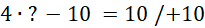 Zapisz wyrażenia ze znakami zapytania oraz liczby obok siebie. Następnie uprość równanie tak, aby znaki zapytania znalazły się po jednej stronie. Dodaj obustronnie 10, ponieważ dodawanie jest działaniem odwrotnym do odejmowania. Aby obliczyć wartość znaku zapytania, podziel 20 na 4, ponieważ dzielenie jest działaniem odwrotnym do mnożenia.