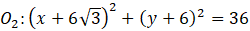 Wyznacz odległość, w jakiej znajdują się środki okręgów: znajdującego się w I ćwiartce O1, którego promień wynosi 8 oraz O2 w III ćwiartce, o promieniu równym 6. Oba okręgi są styczne do osi OX oraz do prostej o równaniu