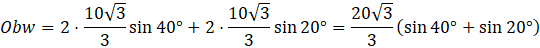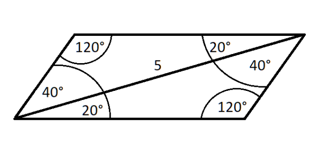W tym zadaniu musisz policzyć jaki jest obwód równoległoboku, którego dłuższa przekątna o długości 5 rozdziela kąt tego równoległoboku na dwa kąty o miarach 20° i 40°.