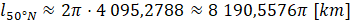 Teraz możesz obliczyć długość trasy wzdłuż równoleżnika 50°N ze wzoru na obwód koła: