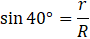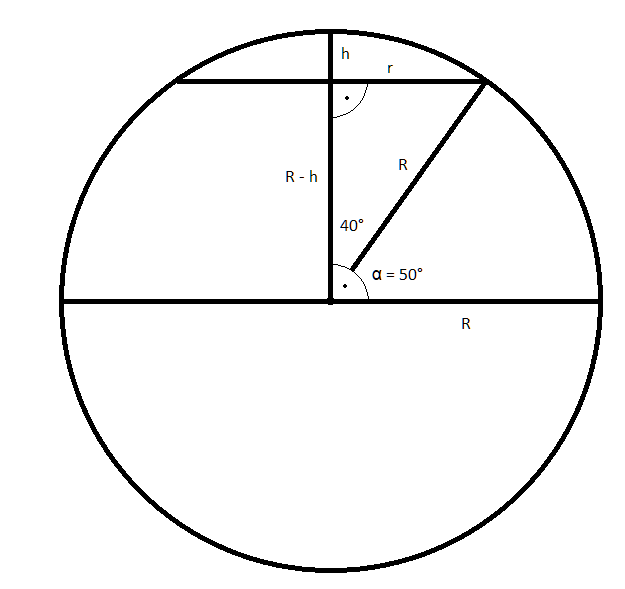 R na rysunku oznacza promień ziemi, zaś r to szukany promień koła ograniczonego przez równoleżnik 50°N. Zauważ, że promień R, promień r oraz promień Ziemi pomniejszony o pewną długość h tworzą trójkąt prostokątny o kącie o mierze 40°. Z definicji funkcji trygonometrycznych możesz zapisać, że: