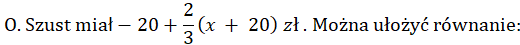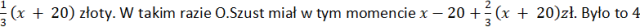 Niech x to będzie gotówka na początku gry. Najpierw N. A. Iwniak wygrał 20 zł i miał x + 20 zł, więc wtedy O. Szust miał x - 20 zł. Następnie N. A. Iwniak przegrał dwie trzecie z tego i został z