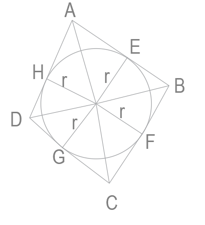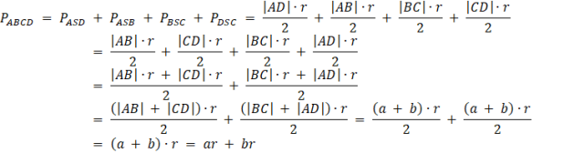Zauważ, że odcinki AS, BS, CS i DS dzielą czworokąt na 4 trójkąty ASD, ASB, BSC i DSC, których wysokości opuszczone na podstawy są równe długości promienia r okręgu wpisanego w ten czworokąt. Suma pól tych trójkątów jest równa polu czworokąta ABCD, czyli
