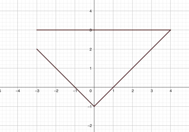 Gdy narysujesz te wykresy w układzie współrzędnych zobaczysz, że te funkcje nie ograniczają pola trójkąta. Gdyby przedłużyć dwa boki tego trójkąta to otrzymasz trójkąt równoramienny o podstawie równej 8 oraz wysokości równej 4, zatem