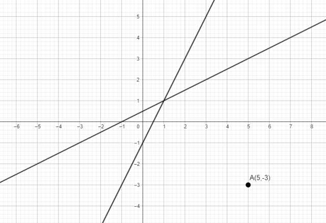 Przekształć podane proste do postaci kierunkowej i stwórz rysunek. Dla ułatwienia ustal, do których prostych należą punkty B oraz C i dorysuj prostej AB oraz AC. Zauważ, że prosta AB jest prostopadła do wysokości CP (
