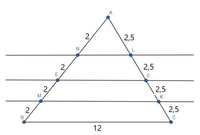 W trójkącie ABC przedstawionym na rysunku mamy boki o następujących długościach: |AB| = 8, |AC| = 10 i |BC| = 12. Dwie proste k i I są równoległe do boku BC. Punkty M, N dzielą bok AB w podanej proporcji: 1:2:1. Musisz obliczyć obwód czworokąta MKLN.